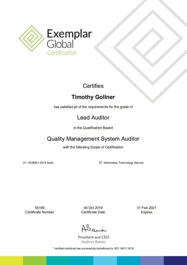 Timothy Gollner has satisfied all of the requirements for the grade of Lead Auditor in the Qualification Based Quality Management System Auditor with the following Scope of CertificationThe Art of Connection